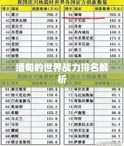 缅甸,这个位于东南亚的国家,近年来在国际舞台上逐渐崭露头角,随着其在政治、经济以及军事领域的不断发展和进步,缅甸的世界战力排名也成为了国际社会关注的焦点,本文将围绕缅甸的世界战力排名展开探讨。